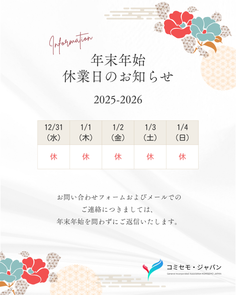 年末年始休業日のお知らせ 2025.12.26 本年も残すところあと僅かとなりました。 皆様には格別のご愛顧を賜り厚く御礼申し上げます。 来年も皆様にとって良い年になりますようお祈り申し上げます。 当法人の年末年始の休業日は以下の通りでございます。 お問い合わせフォームおよびメールでのご連絡につきましては、 年末年始を問わずにご返信いたします。 Post Share Hatena Pocket 進路講演事業-1学期間の実施報告 新年のご挨拶